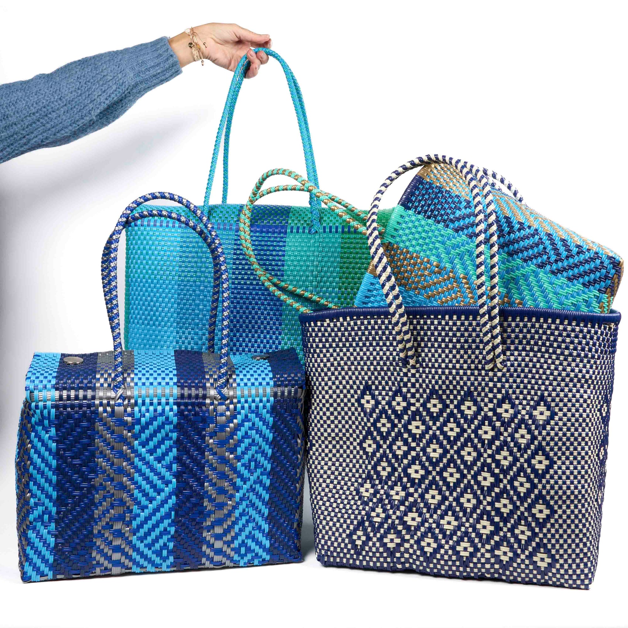 Our woven baskets are handcrafted in Mexico by inmates as part of a rehabilitation workshop, offering them valuable skills and a path to reintegration. Made from 100% recycled plastic, each basket takes about four hours to create and reflects a tradition deeply rooted in Mexican culture. Durable, easily washable, and beautifully designed, these bags combine sustainability, social impact, and everyday style. With every purchase, you support environmental responsibility and help transform lives through meaningful, dignified work - proof that even after a mistake, something meaningful and beautiful can be created.