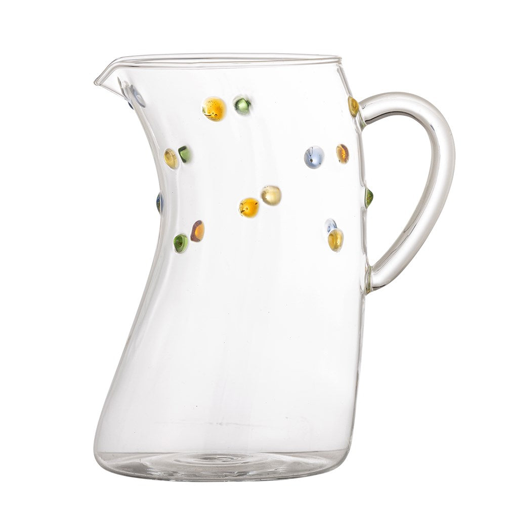 The Thalia Jug by Bloomingville combines practical use with a playful expression. Mouth-blown and adorned with colored glass droplets, the jug creates an elegant yet fun expression. The beautiful design of the jug adds charm to the table setting for any occasion, both for everyday use and festive gatherings.