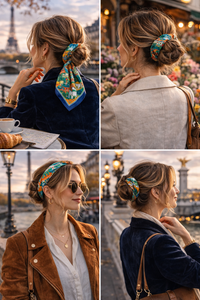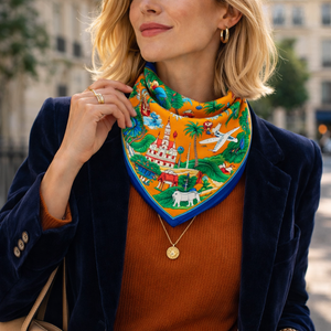 Its 50×50 cm format makes it endlessly versatile: wear it tied around the neck, styled in the hair, wrapped around a handbag, or as a subtle finishing touch to an outfit. Detailed motifs and rich colours add a timeless, Parisian-inspired charm.
